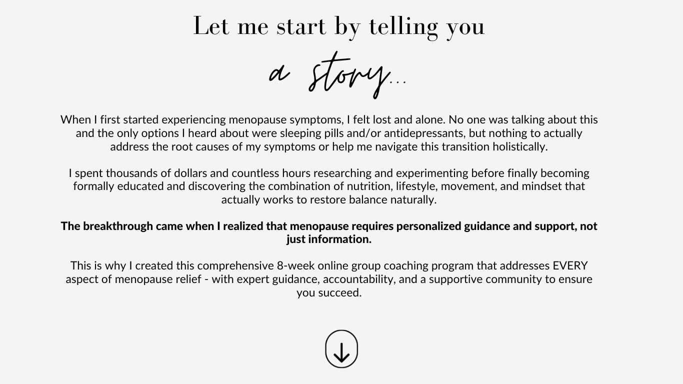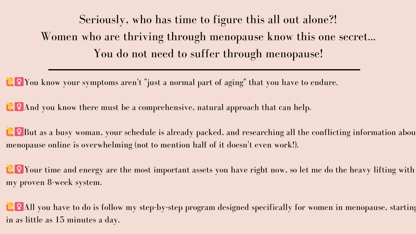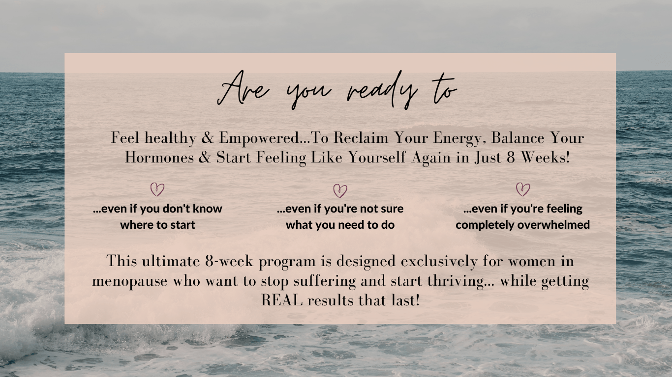 If you are still cycling with your periods, or are just starting to go through the Menopause transition, then my upcoming Perimenopause Pathway Program will be right for you. Click here to sign up for the waitlist and you will be the first to know when it opens.