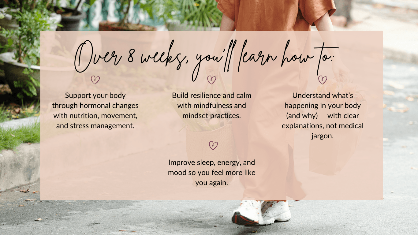 It is an 8 week online group coaching program designed to help midlife women navigate the hormonal changes of menopause. Through personalized strategies based on your menopause stage, you’ll gain tools to optimize your health, manage symptoms, and create sustainable habits for long-term wellness.