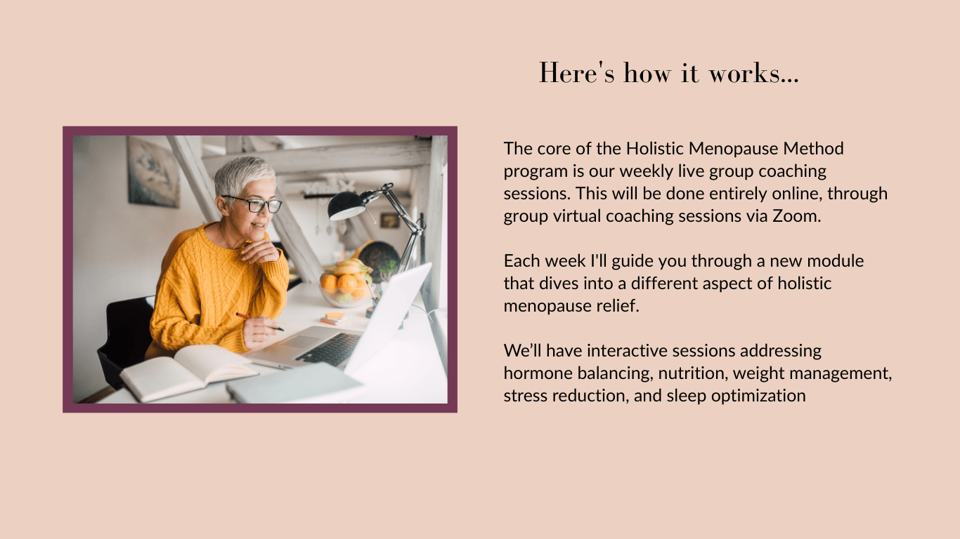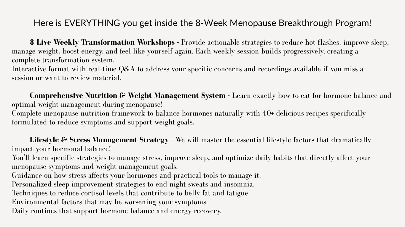 The program includes 8 weekly online group coaching sessions lasting approximately 90 minutes long, with a personalized plan based on your menopause stage, and access to downloadable tools and resources. Each week builds on the previous one, with interactive sessions addressing hormone balancing, nutrition, weight management, stress reduction, and sleep optimization, with materials available in your portal for review, the Monday of each week’s group coaching session.