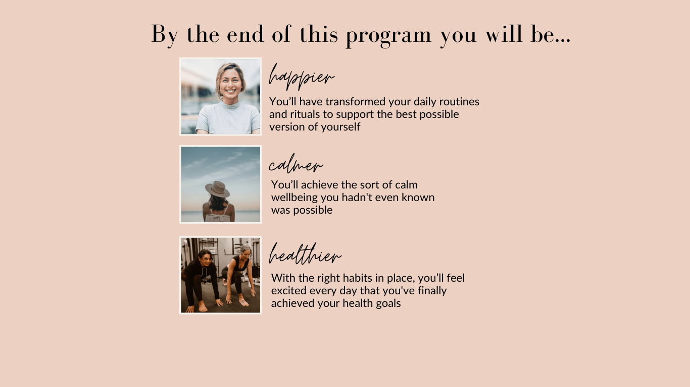 Plan to spend 3 to 5 hours per week, which includes the live coaching session, time to review the materials, and integrate new habits into your routine. The program is designed to fit into a busy schedule as many of the practices (like stress management or nutrition shifts) will naturally fit into your daily routine.